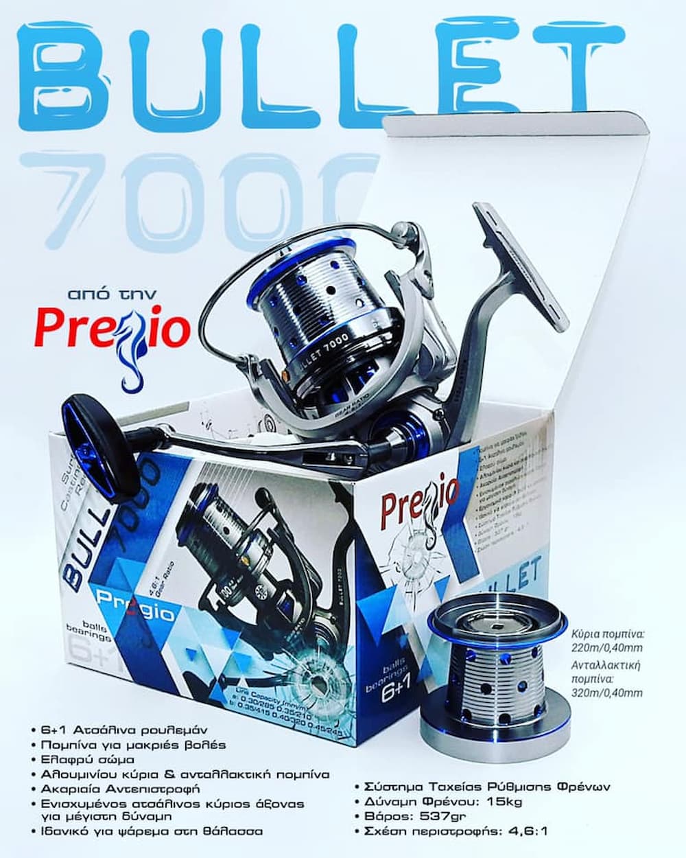 Ο μηχανισμός Pregio Bullet 7000 είναι ειδικά σχεδιασμένος για την τεχνική του Surf Casting, προσφέροντας κορυφαίες επιδόσεις σε μακρινές ρίψεις και ακραία δύναμη έλξης. Με πανίσχυρο σύστημα φρένων που αγγίζει τα 15kg, είναι ο μηχανισμός που θα σας προσφέρει τη σιγουριά που χρειάζεστε για να δαμάσετε μεγάλα θηράματα, διαχειριζόμενος ταυτόχρονα με ευκολία μεγάλα βάρη και μακρινές αποστάσεις.