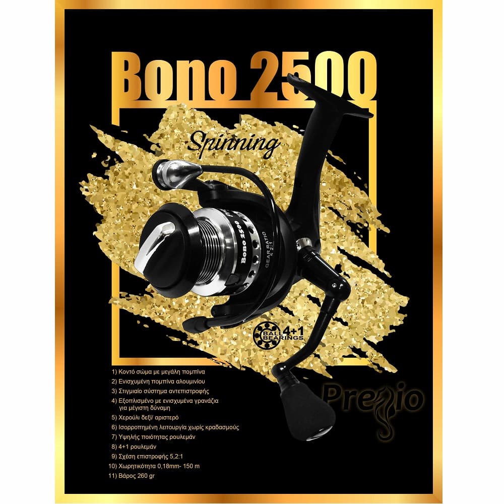 Ο Pregio Bono 2500 δεν χρειάζεται ιδιαίτερες συστάσεις. Είναι ο μηχανισμός που εμπιστεύονται χιλιάδες ψαράδες για την αξιοπιστία και την "βελούδινη" λειτουργία του. Σχεδιασμένος για να προσφέρει μέγιστη απόδοση σε ένα compact και ελαφρύ σώμα, ο Bono 2500 είναι η ιδανική επιλογή για όσους αναζητούν έναν ποιοτικό μηχανισμό που θα αντέξει στον χρόνο και την αλμύρα.
