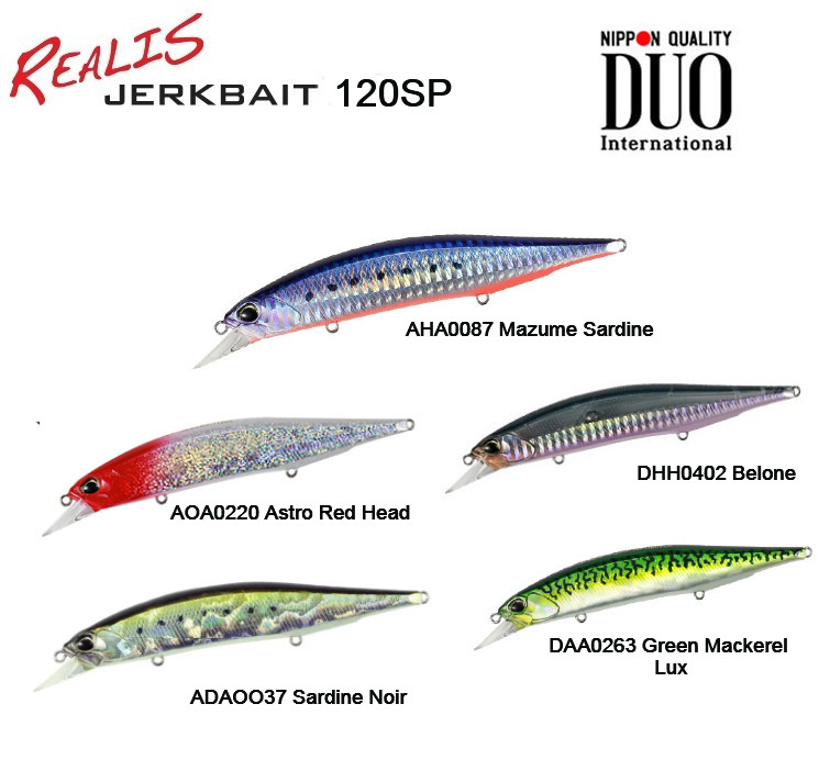Σε αυτή την προσπάθεια, η DUO δημιούργησε νέα στάνταρντ στην κατηγορία των τεχνητών Jerkbait. Τα Realis Jerkbait 120SW SP είναι τεχνητά υψηλών απαιτήσεων με δυνατότητα διατήρησης της πλεύσης τους σε διαφορετικές ταχύτητες ανάκτησης. Προσαρμόστηκαν δε, στις ανάγκες του ψαρέματος σε θαλασσινό νερό και παράχθηκαν σε μερικούς από τους πιο δημοφιλείς χρωματικούς συνδυασμούς της σειράς Tide Minnow, αλλά και σε μοναδικά μοτίβα με στόχο να ενισχυθεί η εικόνα τους ως ένα τεχνητό πολλαπλών χρήσεων από την ακτή, ή τη βάρκα.