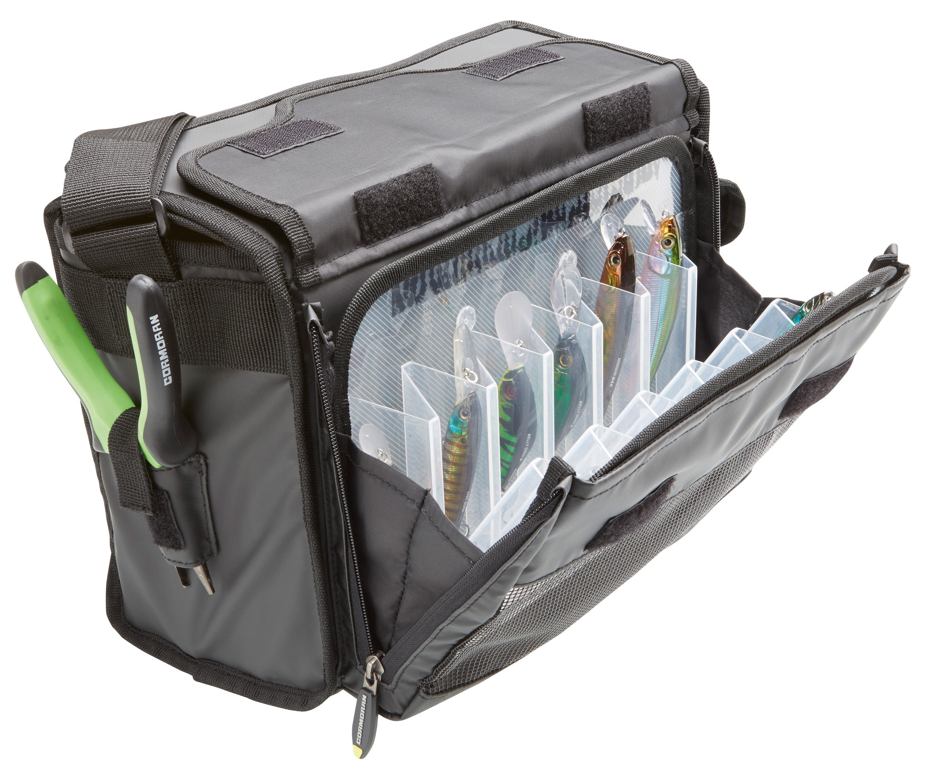 Η εταιρία Cormoran δημιούργησε την τσάντα ώμου για τεχνητά K-don 3008. Στην κύρια θήκη υπάρχουν τρεις κασετίνες διαστάσεων 27.5 x 18 x 4 cm με 19 ρυθμιζόμενες θήκες για δόλωμα και όχι μόνο. Μπορείτε εύκολα και γρήγορα να έχετε πρόσβαση στην κύρια θήκη χάρη στο πτερύγιο velcro.