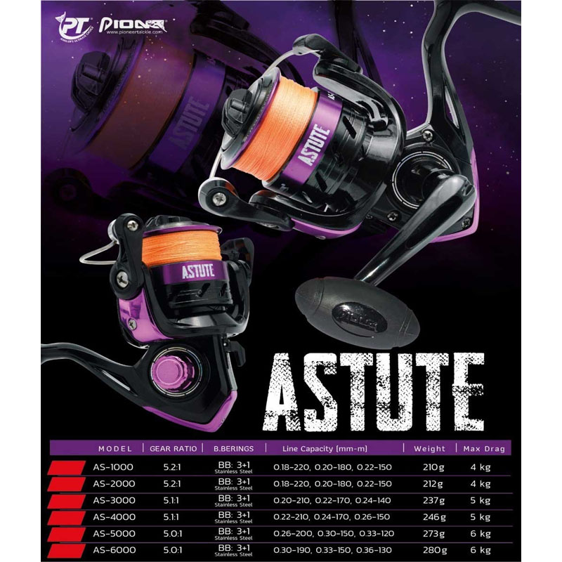 Ο νέος μηχανισμός Pioneer Astute διαθέτει 3+1 ρουλεμάν ακριβείας, σύστημα μπομπίνας με ελικοειδή άξονα από ανοξείδωτο ατσάλι για ομοιόμορφο στρώσιμο της πετονιάς, δίχρωμη μπομπίνα από ανοδιωμένο αλουμίνιο με τρύπες μηχανικής κοπής CNC, χείλος μπομπίνας με χάραξη laser, ενισχυμένο σώμα και ρότορας με μακρομοριακή τεχνολογία πλαστικού (RCM), χυτό μεταλλικό αλουμινένιο βιδωτό χερούλι μηχανικής κοπής CNC που εναλλάσσεται (δεξί/αριστερό).