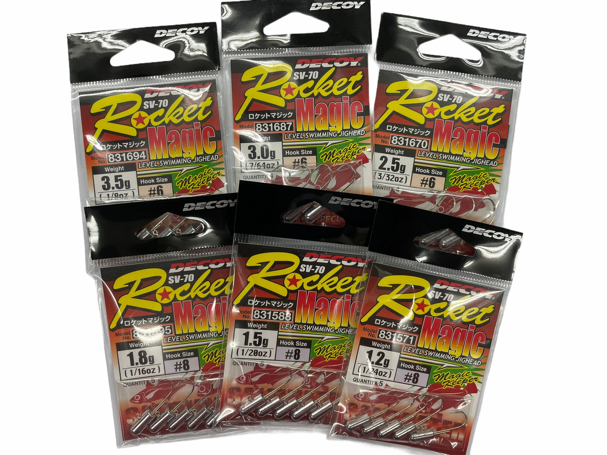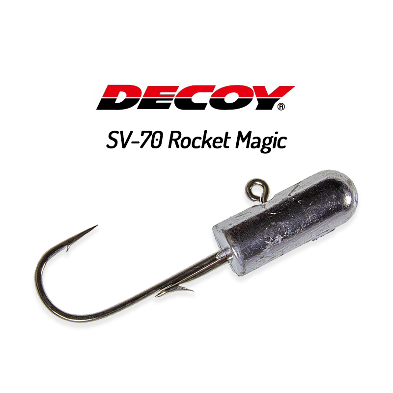 Οι κεφαλές Decoy SV-70 Rocket Magic είναι απλοποιημένες και επιμήκεις σε περισσότερο από το μισό σώμα του γάντζου. Αυτό το κυλινδρικό προφίλ επιτρέπει την καλή κατανομή του βάρους στο σώμα του δολώματος και παράγει αργή και ελεγχόμενη βύθιση. Το αγκίστρι είναι ιδανικό για την τεχνική του LRF και διαθέτει και ακίδα συγκράτησης δολώματος.