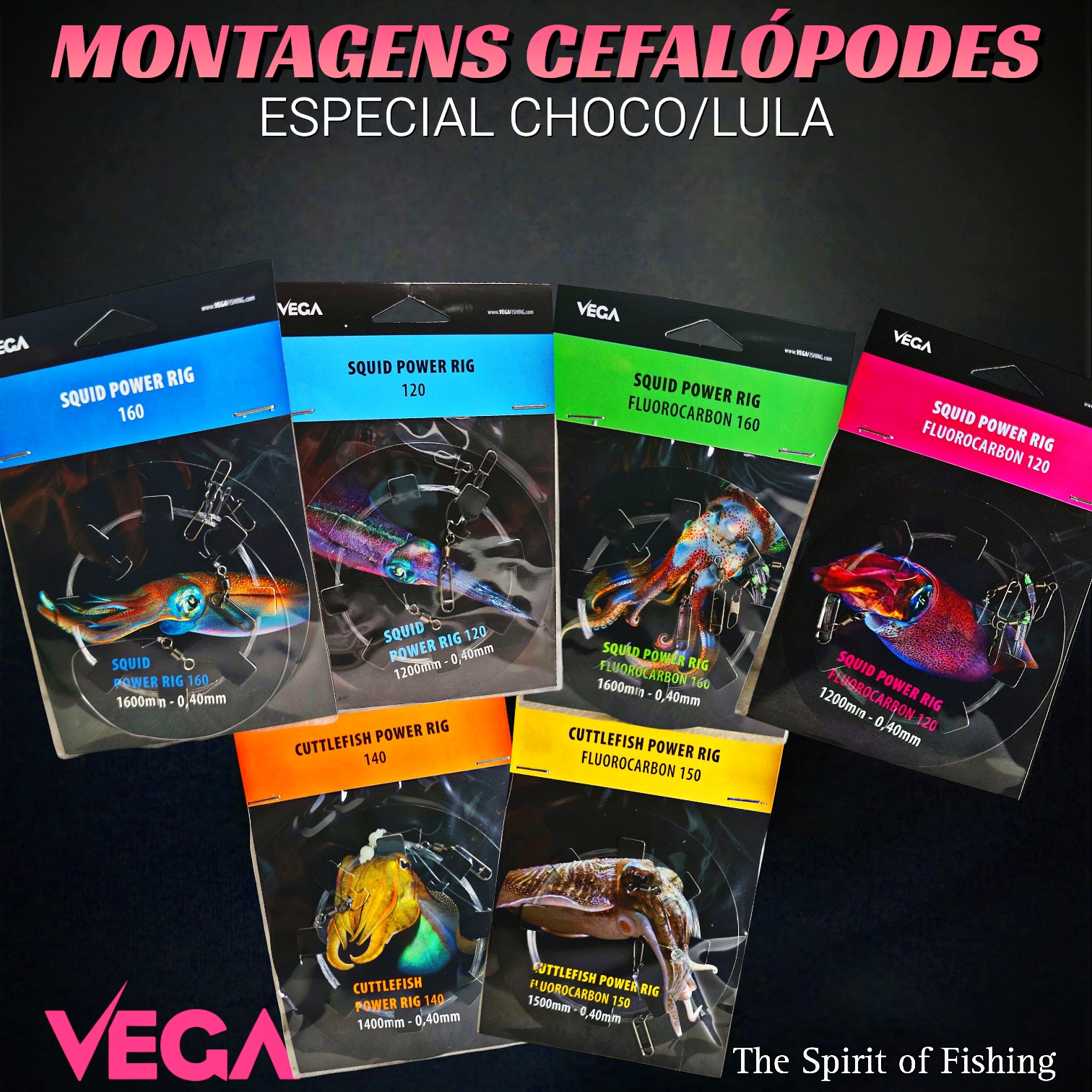Η εταιρία VEGA διαθέτει 4 μοντέλα για ψάρεμα καλαμαριών, δύο με μισινέζα Fluorocarbon και δύο με μισινέζα νάιλον, και 2 μοντέλα για ψάρεμα σουπιών, ένα με μισινέζα fluorocarbon και ένα με μισινέζα νάιλον.