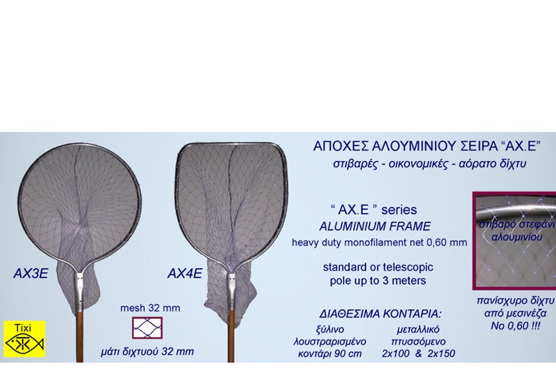 Απόχες αλουμινίου με δίχτυ 0.60mm μεσινεζένιο μάτι 32mm και κοντάρι ξύλινο 90cm.